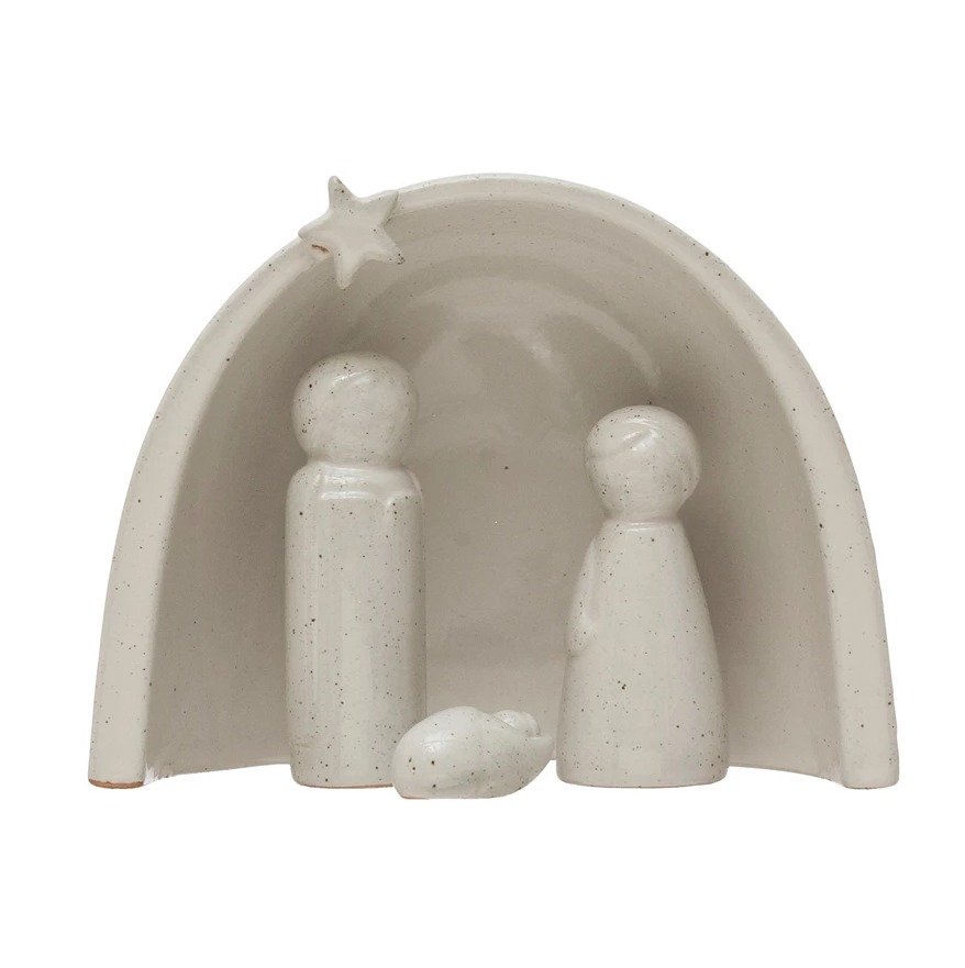 This nativity scene is perfect for displaying in the holiday season. Made out of stoneware, this 4-piece nativity scene has a unique white reactive glaze finish and an organic modern style.